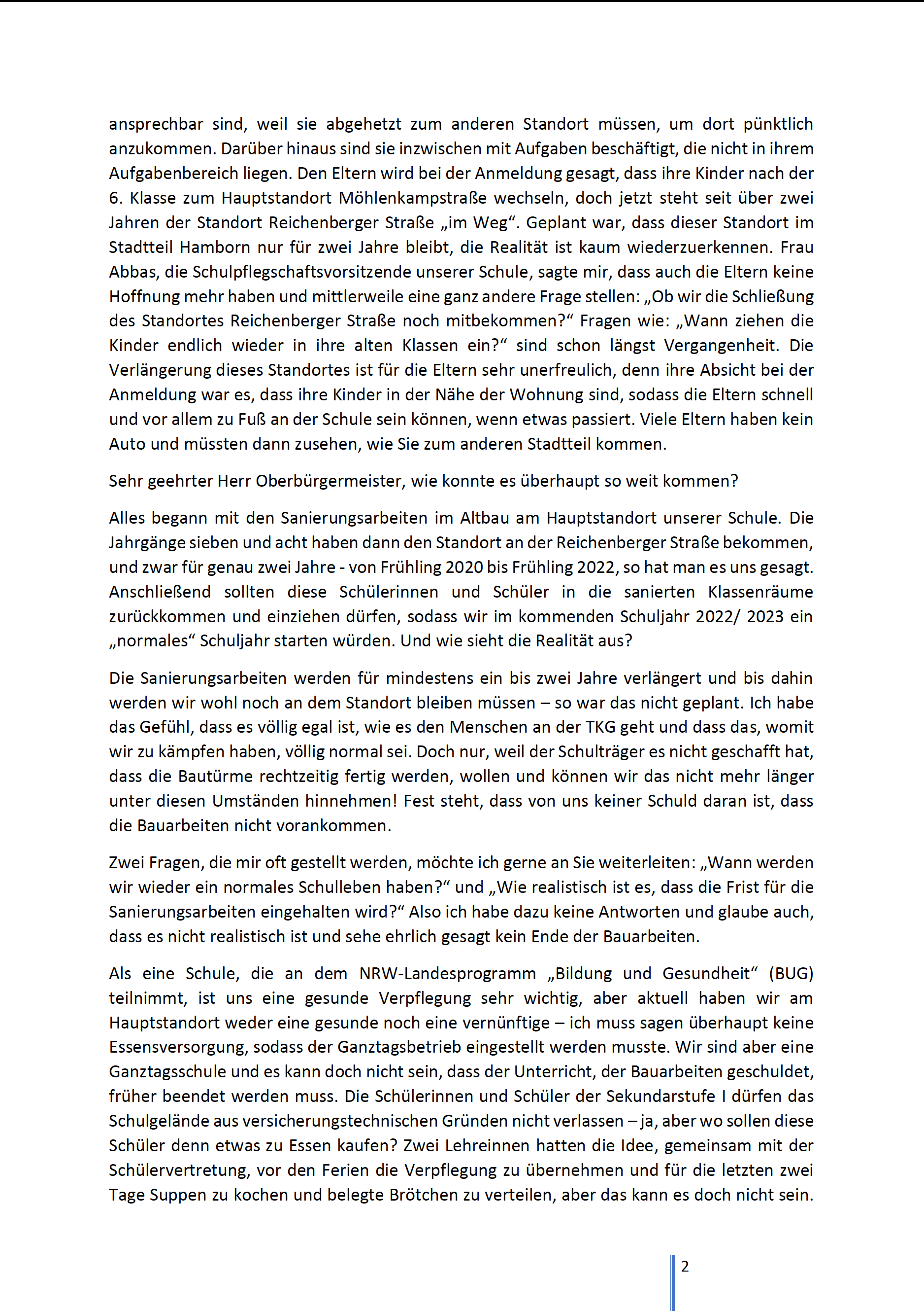 Ich bin mir sicher, dass Sie bereits über die baulichen Mängel und die Brandstiftung an der Theodor-König-Gesamtschule informiert sind. Probleme gibt es leider fast in allen Schulen Duisburgs, doch als Schülersprecher, stelle ich fest, dass die Probleme unserer Schule alle anderen übertreffen und diese schon lange eine ernsthafte Herausforderung für alle Menschen an der TKG darstellen und jetzt nicht mehr zu ertragen sind. Die Grenze ist schon längst überschritten und wir befinden uns nun in einem Zustand, der nicht mehr zu dulden ist.