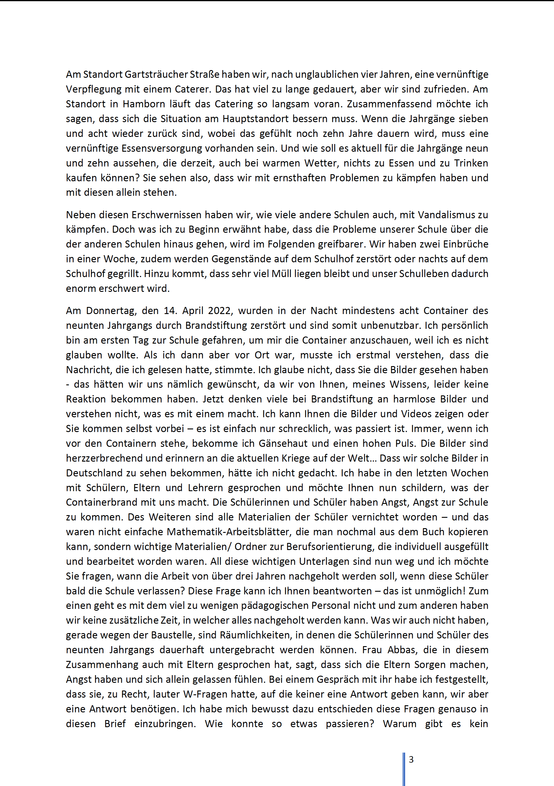 Am Donnertag, den 14. April 2022, wurden in der Nacht mindestens acht Container des neunten Jahrgangs durch Brandstiftung zerstört und sind somit unbenutzbar. Ich persönlich bin am ersten Tag zur Schule gefahren, um mir die Container anzuschauen, weil ich es nicht glauben wollte. Als ich dann aber vor Ort war, musste ich erstmal verstehen, dass die Nachricht, die ich gelesen hatte, stimmte. Ich glaube nicht, dass Sie die Bilder gesehen haben – das hätten wir uns nämlich gewünscht, da wir von Ihnen, meines Wissens, leider keine Reaktion bekommen haben. Jetzt denken viele bei Brandstiftung an harmlose Bilder und verstehen nicht, was es mit einem macht. Ich kann Ihnen die Bilder und Videos zeigen oder Sie kommen selbst vorbei – es ist einfach nur schrecklich, was passiert ist. Immer, wenn ich vor den Containern stehe, bekomme ich Gänsehaut und einen hohen Puls. Die Bilder sind herzzerbrechend und erinnern an die aktuellen Kriege auf der Welt… Dass wir solche Bilder in Deutschland zu sehen bekommen, hätte ich nicht gedacht. Ich habe in den letzten Wochen mit Schülern, Eltern und Lehrern gesprochen und möchte Ihnen nun schildern, was der Containerbrand mit uns macht. Die Schülerinnen und Schüler haben Angst, Angst zur Schule zu kommen. Des Weiteren sind alle Materialien der Schüler vernichtet worden – und das waren nicht einfache Mathematik-Arbeitsblätter, die man nochmal aus dem Buch kopieren kann, sondern wichtige Materialien/ Ordner zur Berufsorientierung, die individuell ausgefüllt und bearbeitet worden waren. All diese wichtigen Unterlagen sind nun weg und ich möchte Sie fragen, wann die Arbeit von über drei Jahren nachgeholt werden soll, wenn diese Schüler bald die Schule verlassen? Diese Frage kann ich Ihnen beantworten – das ist unmöglich! Zum einen geht es mit dem viel zu wenigen pädagogischen Personal nicht und zum anderen haben wir keine zusätzliche Zeit, in welcher alles nachgeholt werden kann. Was wir auch nicht haben, gerade wegen der Baustelle, sind Räumlichkeiten, in denen die Schülerinnen und Schüler des neunten Jahrgangs dauerhaft untergebracht werden können. Frau Abbas, die in diesem Zusammenhang auch mit Eltern gesprochen hat, sagt, dass sich die Eltern Sorgen machen, Angst haben und sich allein gelassen fühlen. Bei einem Gespräch mit ihr habe ich festgestellt, dass sie, zu Recht, lauter W-Fragen hatte, auf die keiner eine Antwort geben kann, wir aber eine Antwort benötigen. Ich habe mich bewusst dazu entschieden diese Fragen genauso in diesen Brief einzubringen. Wie konnte so etwas passieren? Warum gibt es kein Sicherheitspersonal? Wann kommt endlich eine Lösung? Wo sollen die Schülerinnen und Schüler unterrichtet werden und lernen? Aber eine Frage fand ich besonders interessant und zwar: „Wie lange soll das noch gut gehen – und woher können wir wissen, dass nicht noch mehr Container verbrannt werden, wo sind wir dann?“ Nicht zu vergessen ist die Frage, wie unter diesen Umständen die Zukunft der Kinder aussehen soll?
