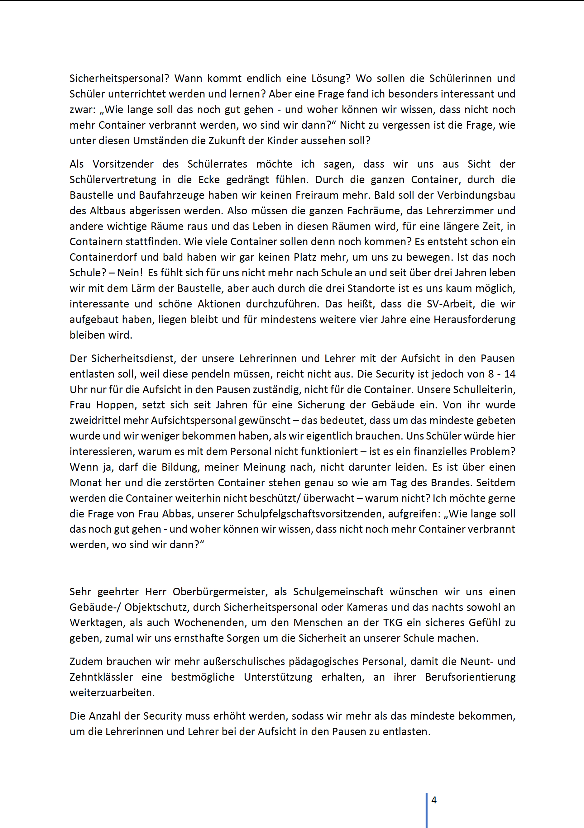 Der Sicherheitsdienst, der unsere Lehrerinnen und Lehrer mit der Aufsicht in den Pausen entlasten soll, weil diese pendeln müssen, reicht nicht aus. Die Security ist jedoch von 8 – 14 Uhr nur für die Aufsicht in den Pausen zuständig, nicht für die Container. Unsere Schulleiterin, Frau Hoppen, setzt sich seit Jahren für eine Sicherung der Gebäude ein. Von ihr wurde zweidrittel mehr Aufsichtspersonal gewünscht – das bedeutet, dass um das mindeste gebeten wurde und wir weniger bekommen haben, als wir eigentlich brauchen. Uns Schüler würde hier interessieren, warum es mit dem Personal nicht funktioniert – ist es ein finanzielles Problem? Wenn ja, darf die Bildung, meiner Meinung nach, nicht darunter leiden. Es ist über einen Monat her und die zerstörten Container stehen genau so wie am Tag des Brandes. Seitdem werden die Container weiterhin nicht beschützt/ überwacht – warum nicht? Ich möchte gerne die Frage von Frau Abbas, unserer Schulpfelgschaftsvorsitzenden, aufgreifen: „Wie lange soll das noch gut gehen – und woher können wir wissen, dass nicht noch mehr Container verbrannt werden, wo sind wir dann?“
