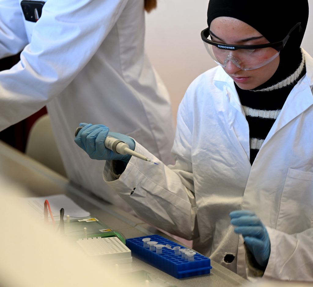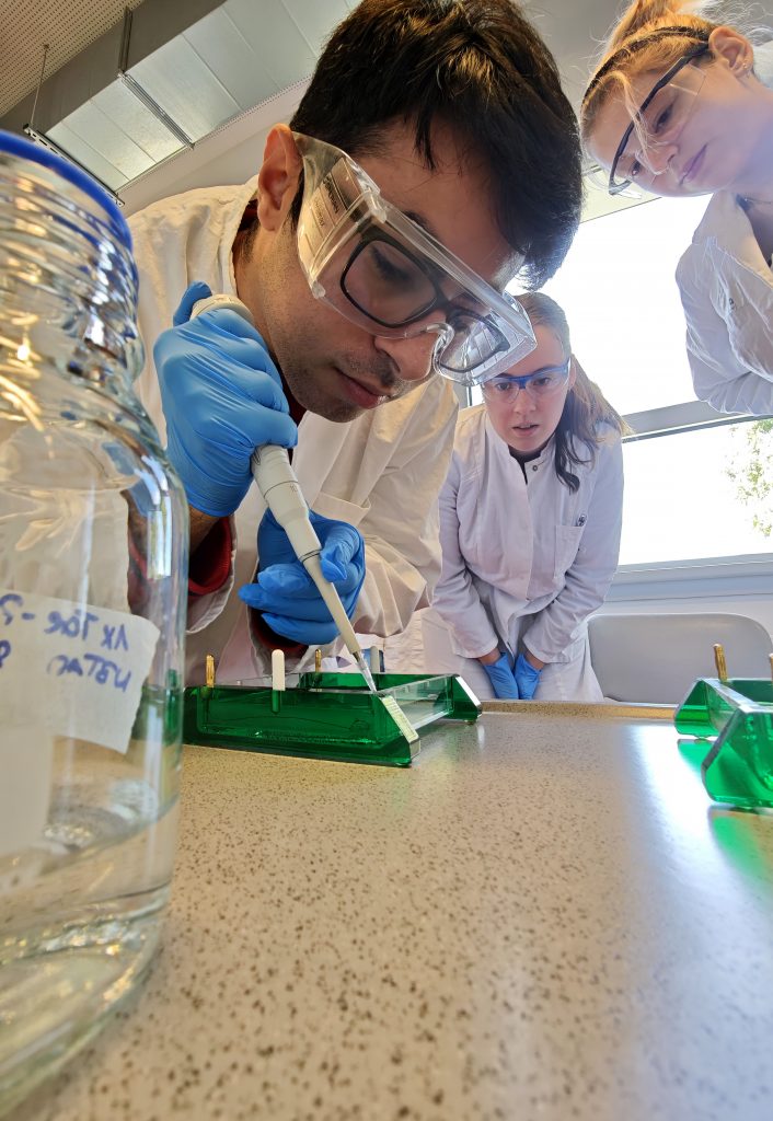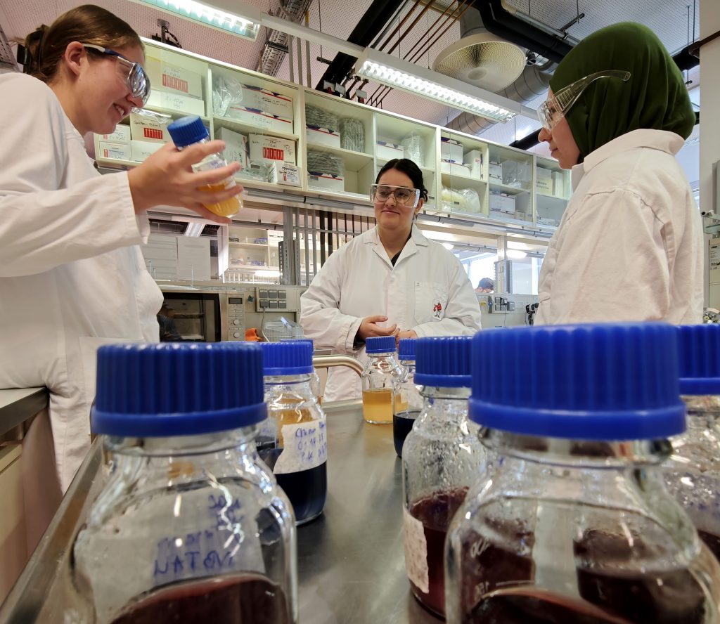 Melike: „Wir durften im Mikrobiologie-Labor selbst Petrischalen vorbereiten, indem wir sterilisierten Agar in die Schalen gossen, um darauf später Bakterien zu kultivieren. Danach konnten wir unter dem Mikroskop Bakterien wie E. coli entdecken, und der gesamte Tag im Labor hat uns viel Freude bereitet und unser Interesse an der Mikrobiologie geweckt.“