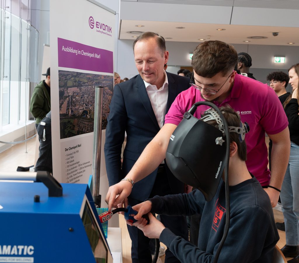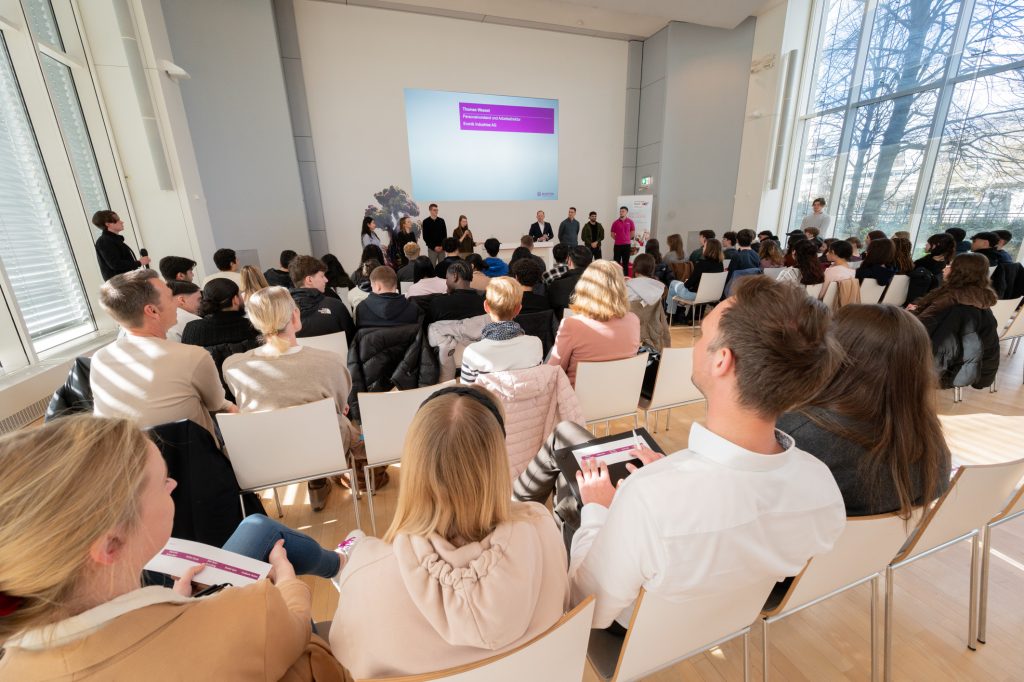 Gut anderthalb Stunden stellte sich Herr Thomas Wessel, Personalvorstand und Arbeitsdirektor der Evonik Industries AG Essen, den Fragen der SchülerInnen aus drei teilnehmenden Schulen und gab so einen informativen und anschaulichen Einblick in das Unternehmen, den aktuellen, auch geopolitisch bedingten Herausforderungen und die Unternehmensstrategien in Bezug auf Nachhaltigkeit, Digitalisierung und Produktentwicklung. Aber auch persönliche Fragen zu seinen Hobbies, seinem Arbeitsalltag, seiner Familie etc. beantwortete er offen, was die SchülerInnen sehr beeindruckte und sie durften erfahren, Herr Wessel hat zwar einen Dienstwagen und Chauffeur, aber die tägliche Fahrzeit von drei Stunden ist Arbeitszeit, denn da telefoniert man, bereitet Sitzungen vor oder arbeitet am Laptop. Unterstützt wurde er dabei von Angestellten, Auszubildenden und Trainees, die noch mal einen anderen Blick eröffneten.